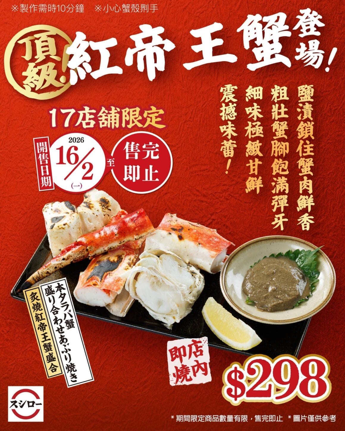 炙燒紅帝王蟹盛合,嚴選頂級嘅紅帝王蟹震撼登場(售港幣 $298 )。