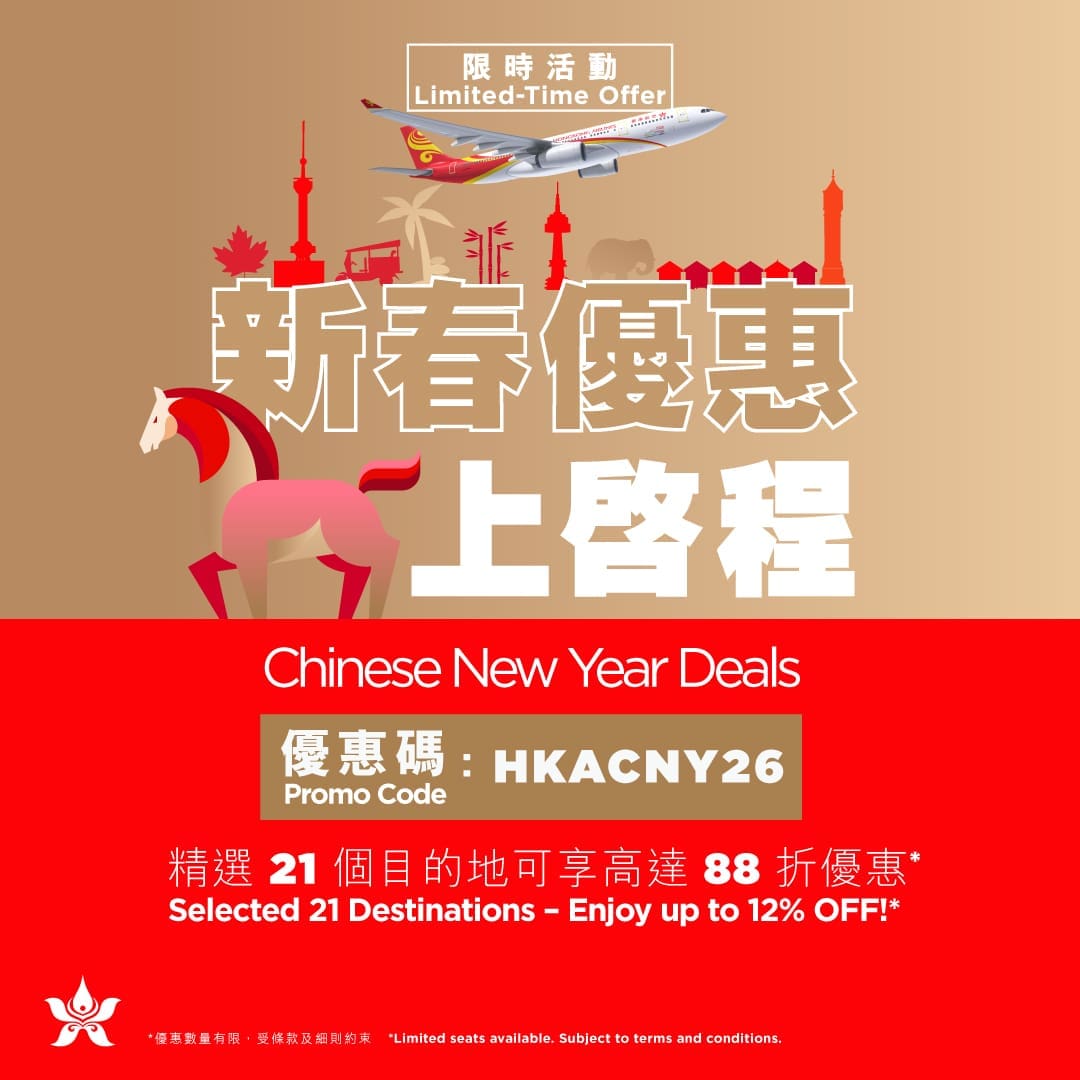 香港航空推出限時活動,精選 21 個目的地輸入優惠碼「HKACNY26」享高達 88 折優惠。