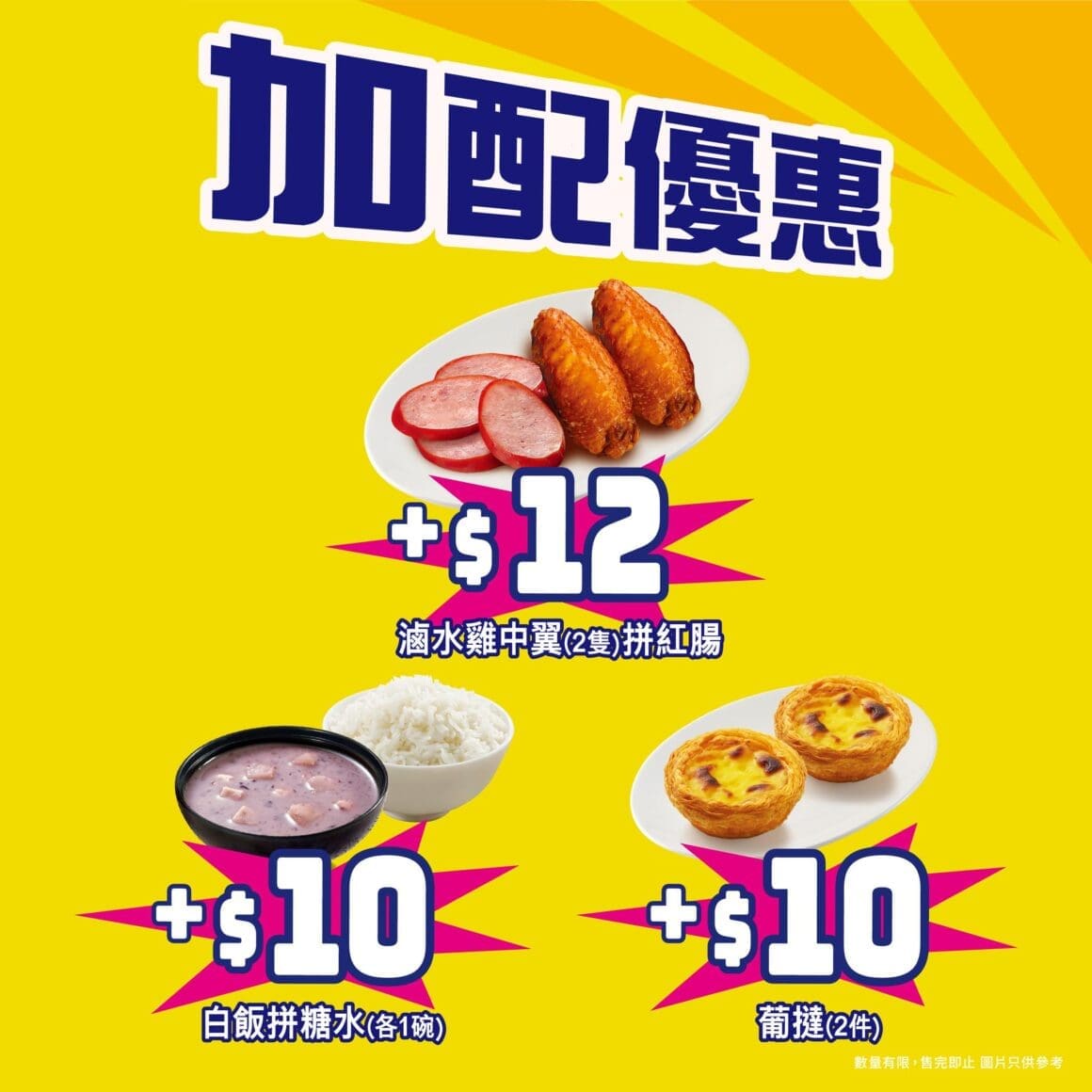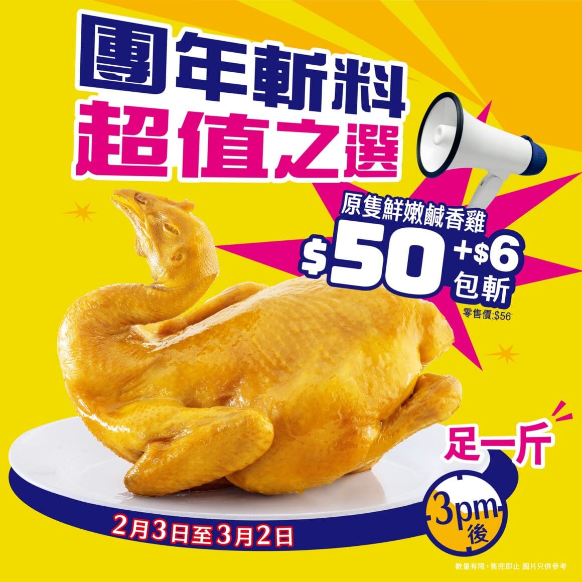 只限今日下午 3 點後外賣原隻免斬只需 $50 ,加配優惠包括 +$12 滷水雞翼( 2 隻)拼紅腸;+$10 白飯拼糖水(各 1 客);+$10 葡撻( 2 件)。