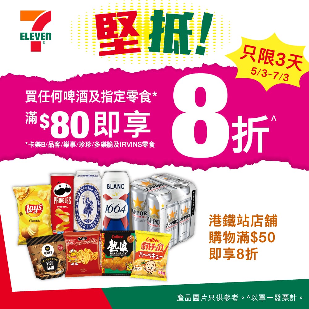 優惠內容:於全線 7-Eleven 及港鐵站內指定 7-Eleven 分店購買啤酒及指定零食滿港幣 $80(或港幣 $50)享 8 折優惠