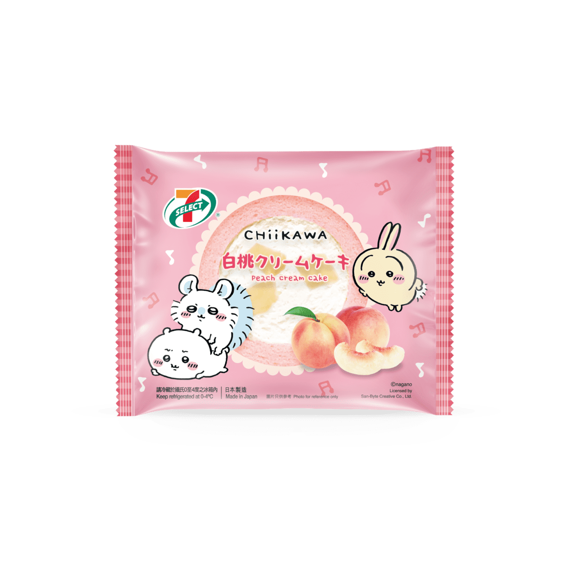 蛋糕內餡加入真實白桃果粒,每一口都能品嚐到清甜果香與細緻口感。配合順滑忌廉,味道清新平衡,包裝印有 CHIIKAWA 人氣角色,視覺與味覺同樣滿足。