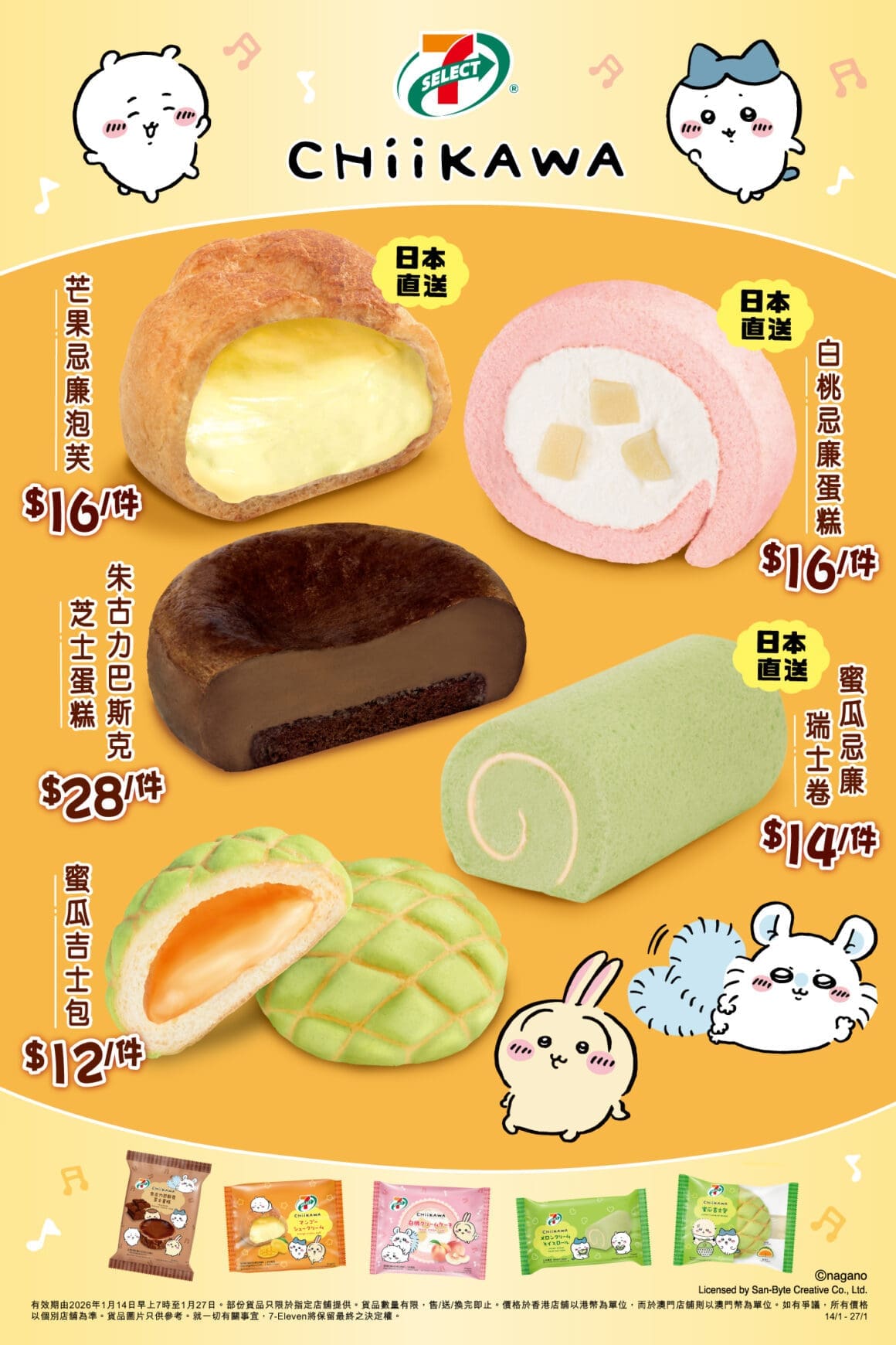 為迎接新一年,7-Eleven 於 2026 年 1 月 14 日起推出全新 CHIIKAWA 系列,將人氣角色的可愛魅力注入自家品牌 7-SELECT 烘焙及甜品之中。是次系列合共推出 5 款期間限定新品,涵蓋泡芙、蛋糕、瑞士卷及日式麵包,以水果及朱古力風味為主調,為顧客帶來新鮮味覺體驗, CHIIKAWA 粉絲記得準時到 7-Eleven 入手。