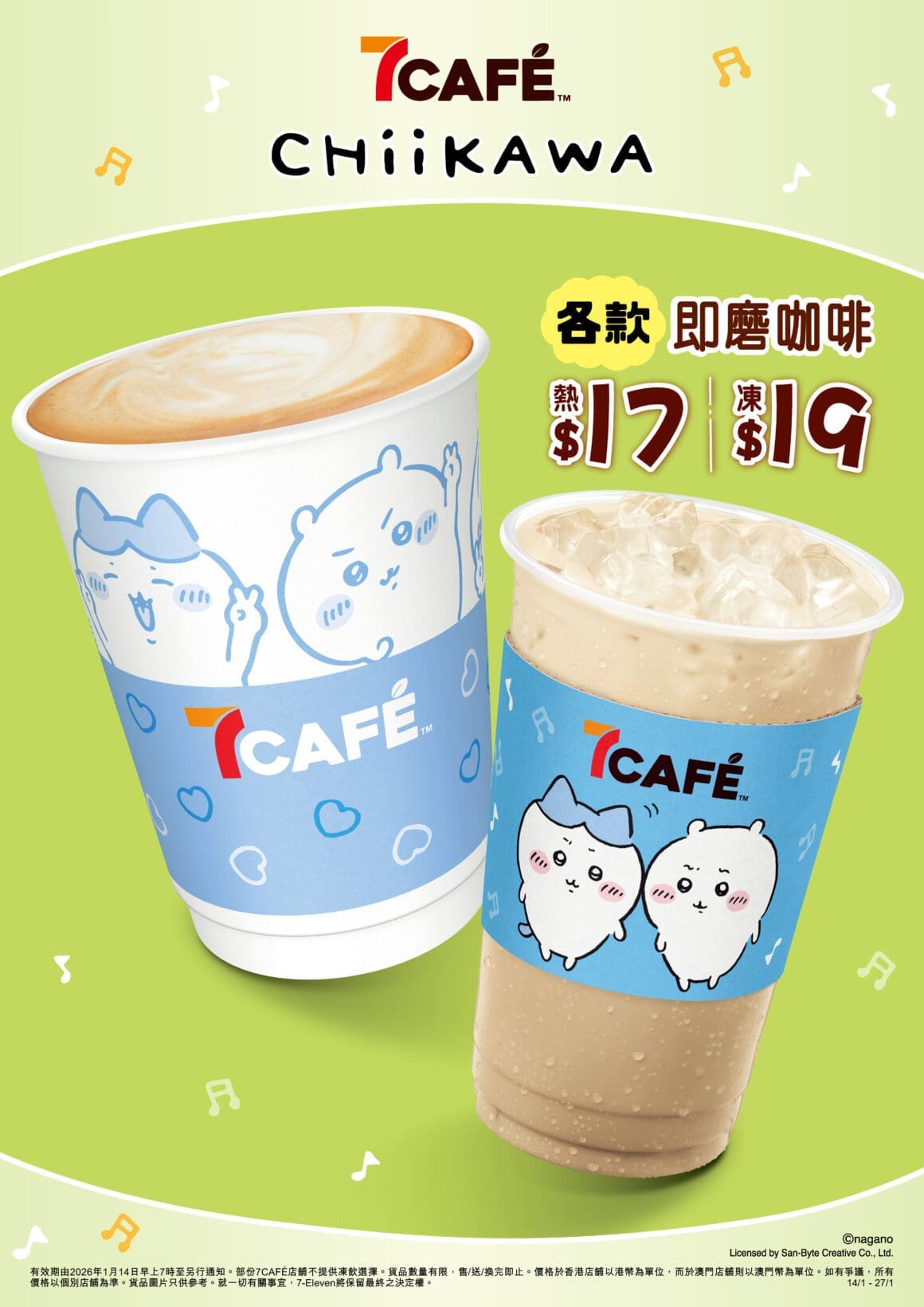 除了 7-SELECT 新品外,7-Eleven 另一自家品牌 7CAFÉ 亦為熱飲及凍飲換上 CHIIKAWA 限定設計杯身及杯套。顧客凡於 7CAFÉ 購買任何熱飲或凍飲,即可獲贈 CHIIKAWA 設計限定杯套一款,款式將分階段推出,極具收藏價值。首波 7CAFÉ CHIIKAWA 熱飲杯身及凍飲杯套將於 2026 年 1 月 14 日登場,其後款式詳情將於 7-Eleven 官方社交平台公佈。