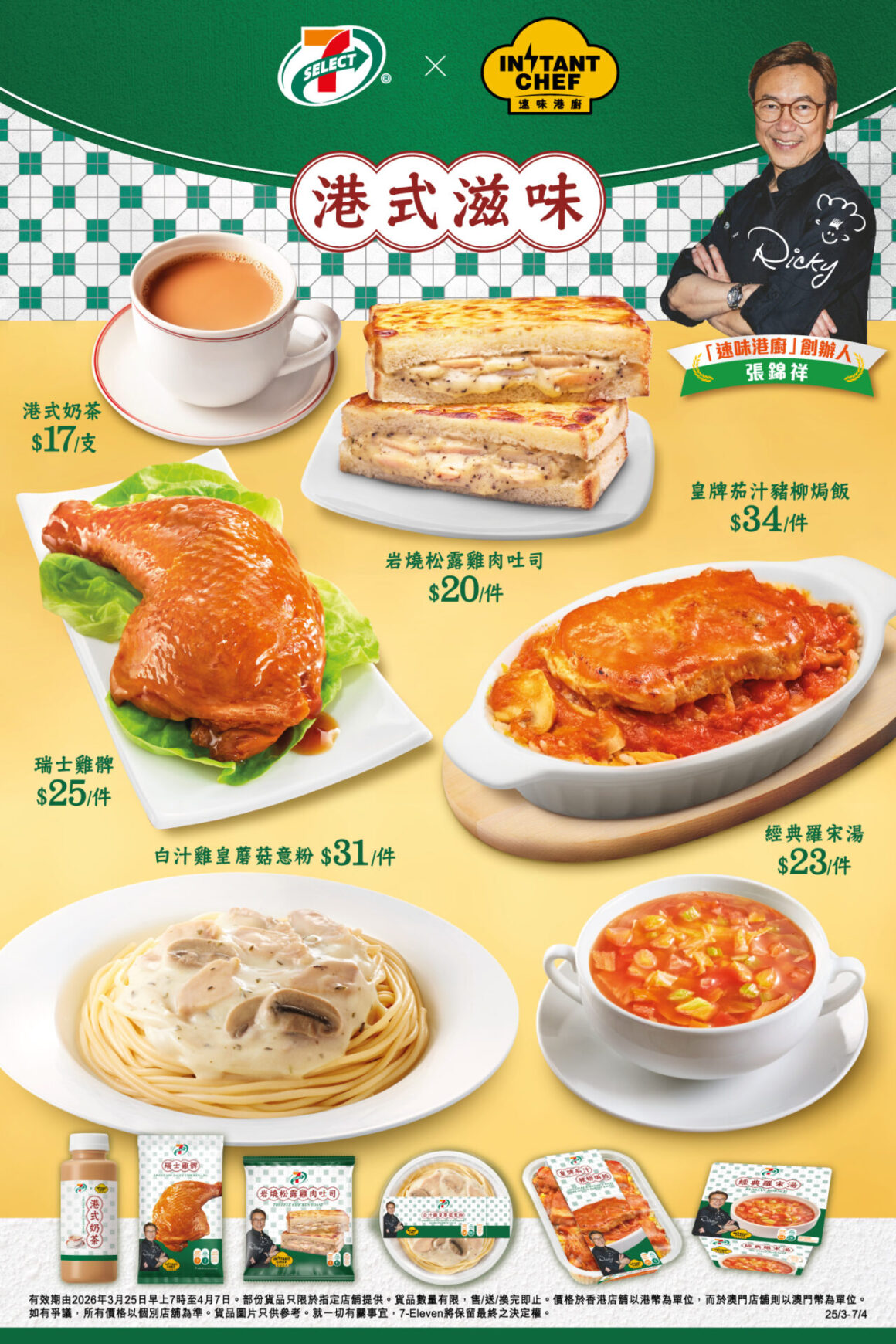 7-Eleven 自家品牌 7-SELECT 再度攜手本地人氣品牌「速味港廚」,由 3 月 25 日起推出 6 款限定聯乘港式美食,售價由港幣 $17 起。聯乘系列由星級名廚張錦祥師傅(Ricky)監製,涵蓋輕食、主餐及飲品,讓市民隨時隨地在 7-Eleven 品嚐道地港式滋味。與此同時,7-Eleven 旗下另一品牌 7 仔食檔亦同步推出 2 款限定新品,同屬此次聯乘系列。