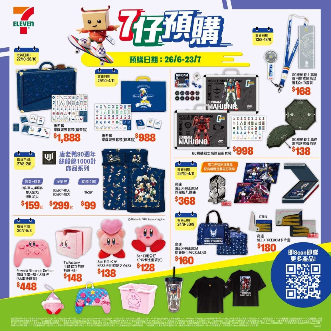 新一期 7 仔預購「限時新品」由 6 月 26 日早上 7 時起登場,為大家帶來一系列全新「唐老鴨 90 週年系列」周邊產品,從時尚的家庭娛樂套裝,到實用的絲般綿 1,000 針床品、可愛的旅行折疊收納袋和背包,完美詮釋唐老鴨的經典形象,通通都是粉絲們的夢幻單品!另外,萬眾矚目的 SEED FREEDOM 及機動戰士高達系列周邊亦同步登陸「限時新品」!包括珍藏版八達通、首次推出的麻雀套裝等,讓你隨時隨地都能展現對高達的熱愛,為日常生活增添充滿機魂的氛圍!