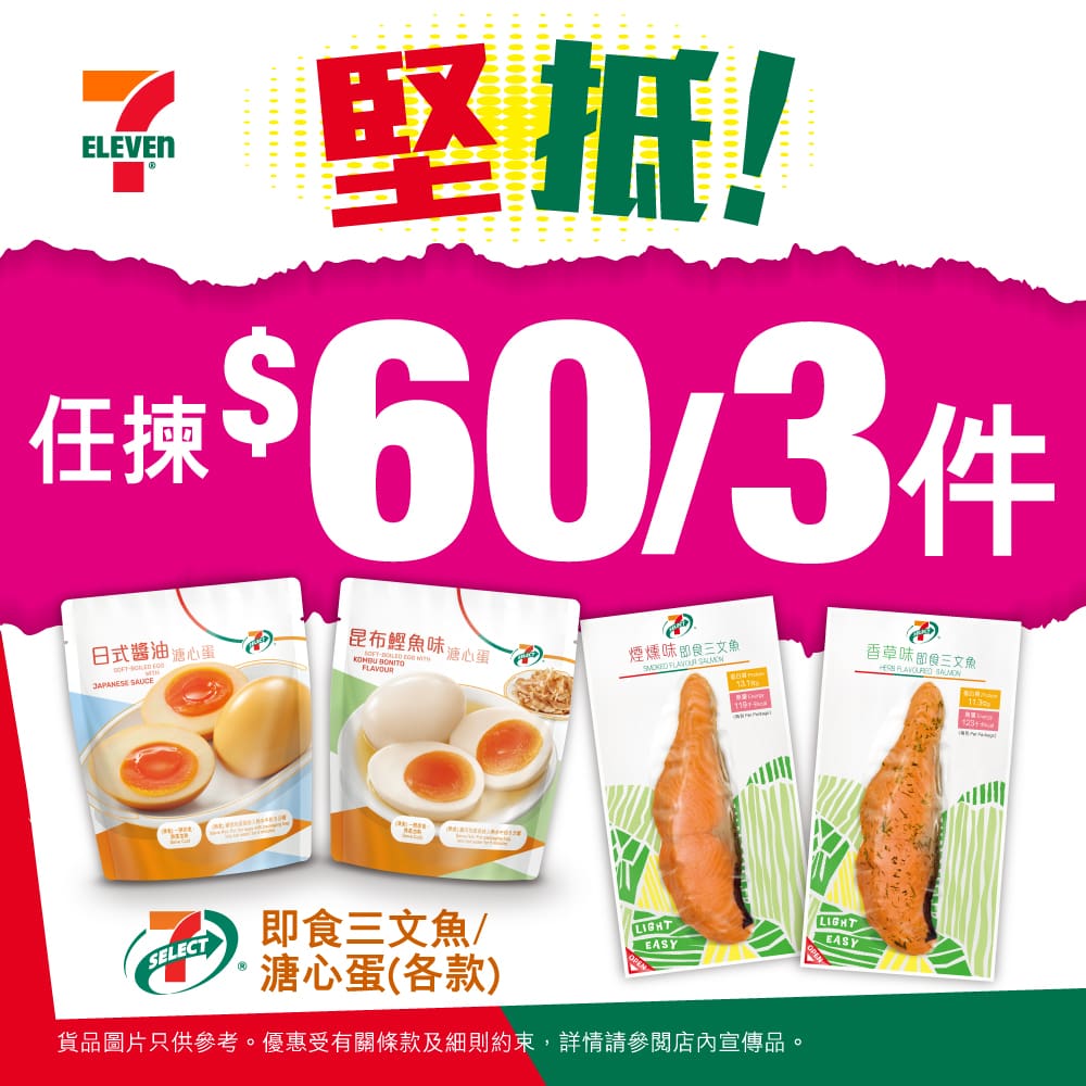 • 任揀 3 件 7-SELECT 三文魚或溏心蛋優惠價港幣 $60