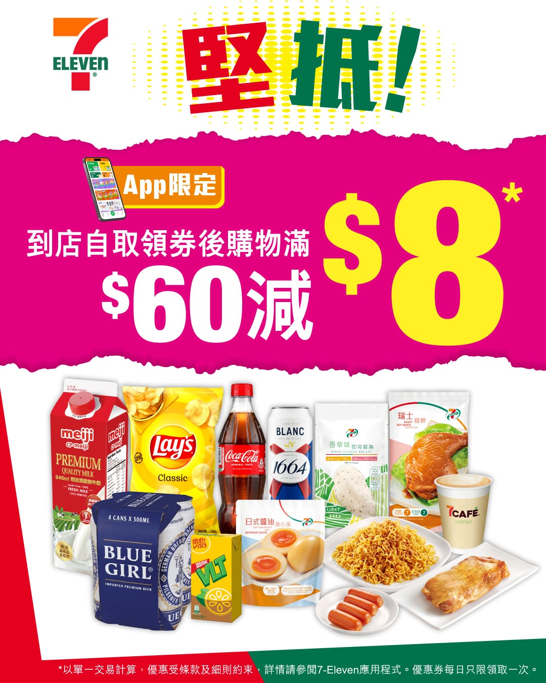 • 7 仔 App 每日送券消費滿港幣 $60 即減港幣 $8