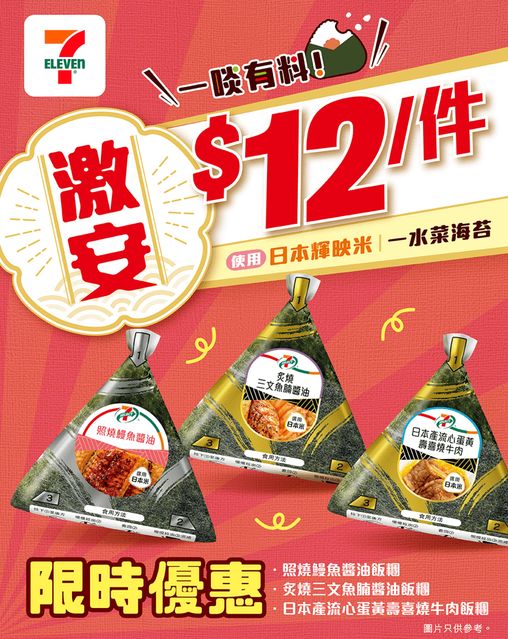 本次優惠涵蓋三款人氣 7-SELECT 飯糰,分別是照燒鰻魚醬油飯糰、炙燒三文魚腩醬油飯糰,以及日本產流心蛋黃壽喜燒牛肉飯糰。飯糰採用日本輝映米與一水菜海苔,保證米飯質素與味道。優惠價僅需港幣 $12 一件,顧客可於 2026 年 1 月 19 日早上 7 時起至 1 月 21 日,在指定 7-Eleven 店鋪搶購。活動貨品數量有限,部分貨品僅於指定店鋪供應,售/送/換完即止。當中價格於香港店鋪以港幣計算,澳門店鋪則以澳門幣計算,如有價格爭議,將以個別店鋪為準。飯糰皆採獨立包裝,確保食用安全與品質。