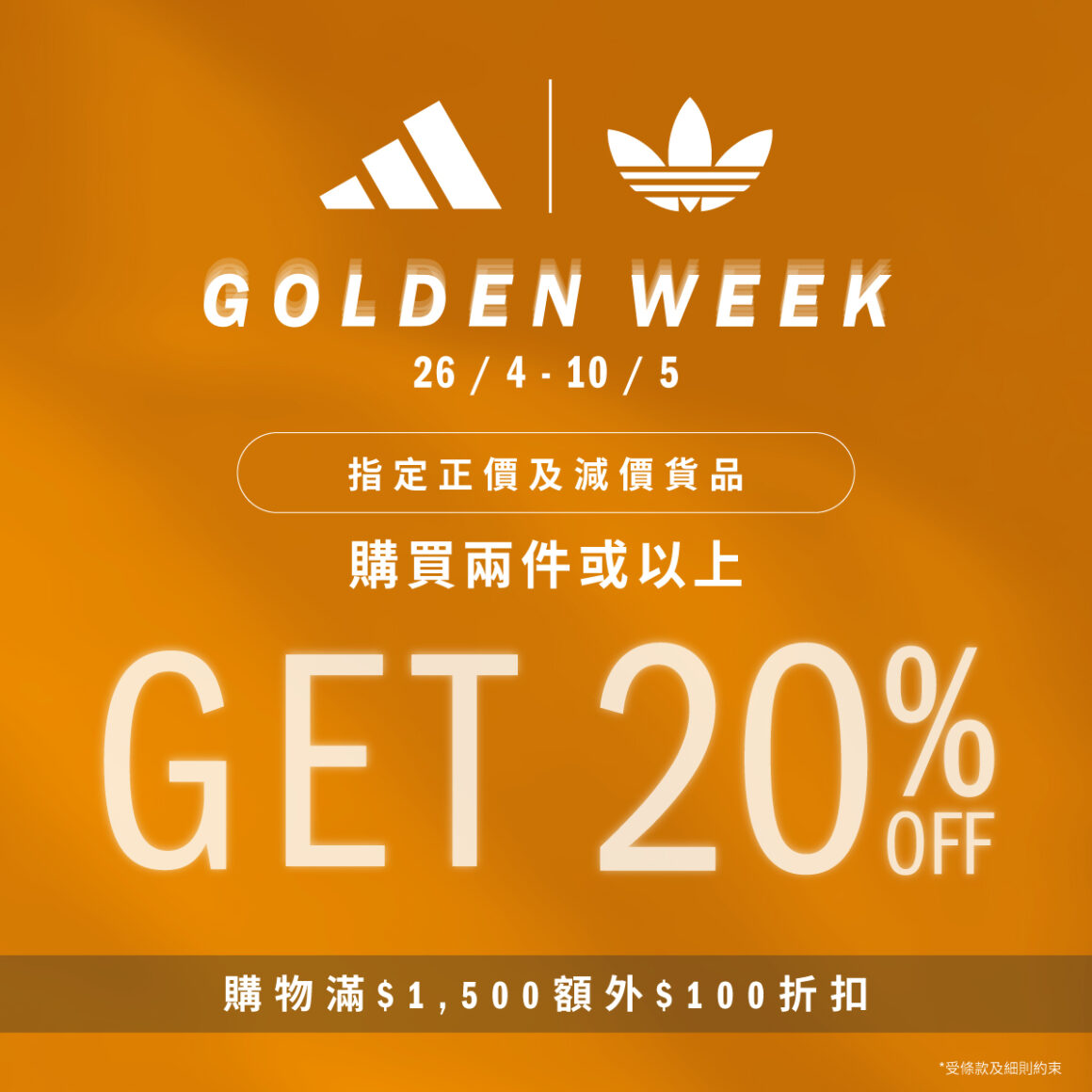 adidas 香港宣佈於 2026 年 4 月 26 日起舉行「黃金週」(Golden Week)大特賣,指定鞋履及服飾買 2 件可享額外 8 折優惠,消費滿港幣 $1,500 更可再減港幣 $100,優惠涵蓋 Ultraboost 跑鞋、Samba、Gazelle 等人氣波鞋及運動服飾,優惠期至 5 月 10 日止,全部於 adidas 香港官方網站購買。