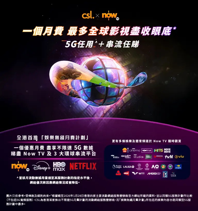 香港電訊宣布推出全新「娛樂無縫月費計劃」,成為全港首個主打不限速無限 5G 本地流動數據的月費方案,同時整合多個 Now TV 娛樂及體育內容,一個月費即可滿足高速上網、影視娛樂及體育直播等多重需要。計劃適用於 1O1O 及 csl 客戶,特別針對長時間使用流動數據、經常煲劇或追看大型體育賽事的用戶而設。即日起申請指定計劃,更可獲得 總值超過 港幣 $4,300 的迎新禮遇,包括行動電源、AI 服務、手機及配件禮券,以及 Club 積分回贈,進一步提升整體性價比。唯當月流動數據用量達至其服務計劃的指定水平後,網絡優次將因應網絡情況或會降低,首 6 個月可享每月 1TB 全速數據,其後每月降至 500GB 。