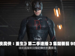由差利哥士( Charlie Cox )主演的漫威英雄劇集《夜魔俠:重生》( Daredevil: Born Again )第二季,正於串流平台 Disney+ 以每周播出形式更新,全季共 8 集,首集於 2026 年 3 月 24 日上線,至今已播出 3 集,全季將於 5 月 5 日完結。第二季承接金蜘蛛威爾遜費斯克( Wilson Fisk )以市長身份掌控紐約、發出通緝令追捕夜魔俠的危局,主線轉為地下抗爭— Matt Murdock 在蒙面身份被全城追殺的處境下,如何重整力量,以孤身之姿對抗腐敗建制。更令漫威粉絲振奮的是,姬絲坦麗達( Krysten Ritter )飾演的積斯嘉鍾斯( Jessica Jones )強勢回歸,加入 Murdock 的抵抗陣線,令第二季的擴充野心一目了然。爛蕃茄目前評分高達 95%,大幅超越第一季的 87%,口碑走勢凌厲。