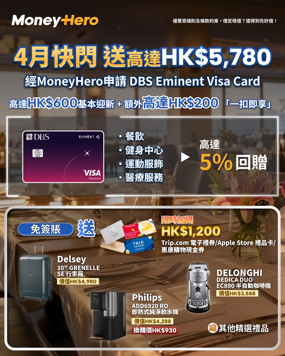 成功申請並獲批 DBS Eminent Card 的新客戶,於指定簽賬期內累積零售簽賬達港幣 $5,000,可獲港幣 $500 現金回贈;完成 Flexi Shopping 申請另享額外港幣 $100,合共高達港幣 $600 銀行迎新獎賞。於 4 月 28 日前申請的新客戶,另可享高達港幣 $200「一扣即享」超市消費回贈,迎新總獎賞最高可達港幣 $800(立即登記)。