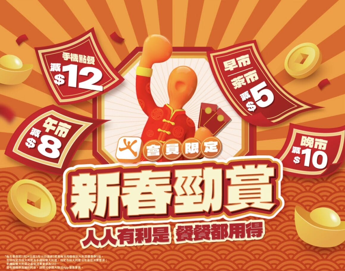 踏入新春,大快活 推出「人人有利是」會員限定活動,由即日起至 2026 年 3 月 16 日,一連三星期每日送出總值港幣 $40 電子大利是,涵蓋早市、午市、茶市、晚市及手機點餐優惠。只要登入 App,即可領取五張電子優惠券,全日不同時段都有折扣,餐餐都可慳一筆。