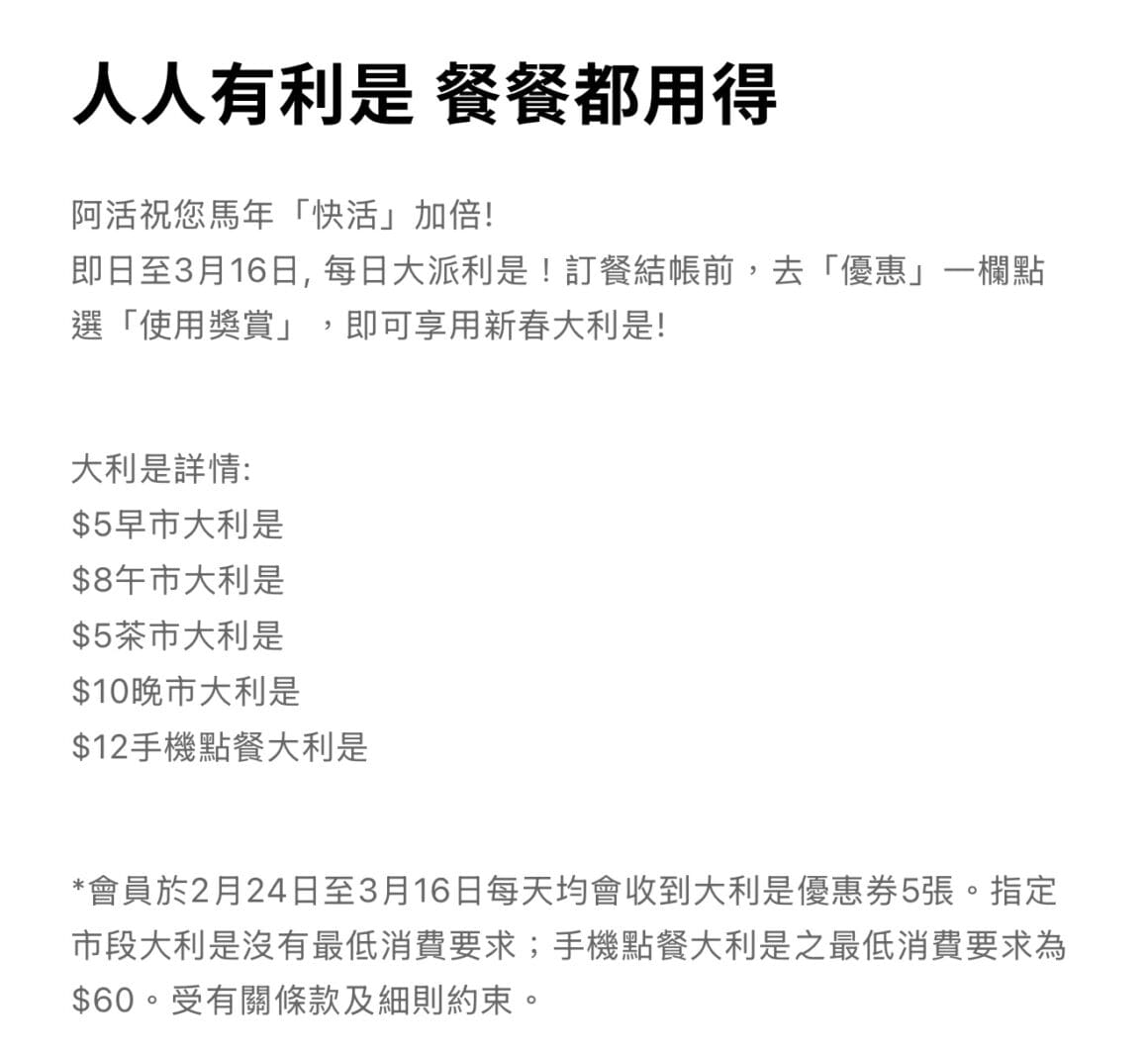 優惠對象為大快活會員,用戶只需每日登入 App,系統即自動派發電子大利是。點餐結帳前於「優惠」欄選擇「使用獎賞」即可套用。
