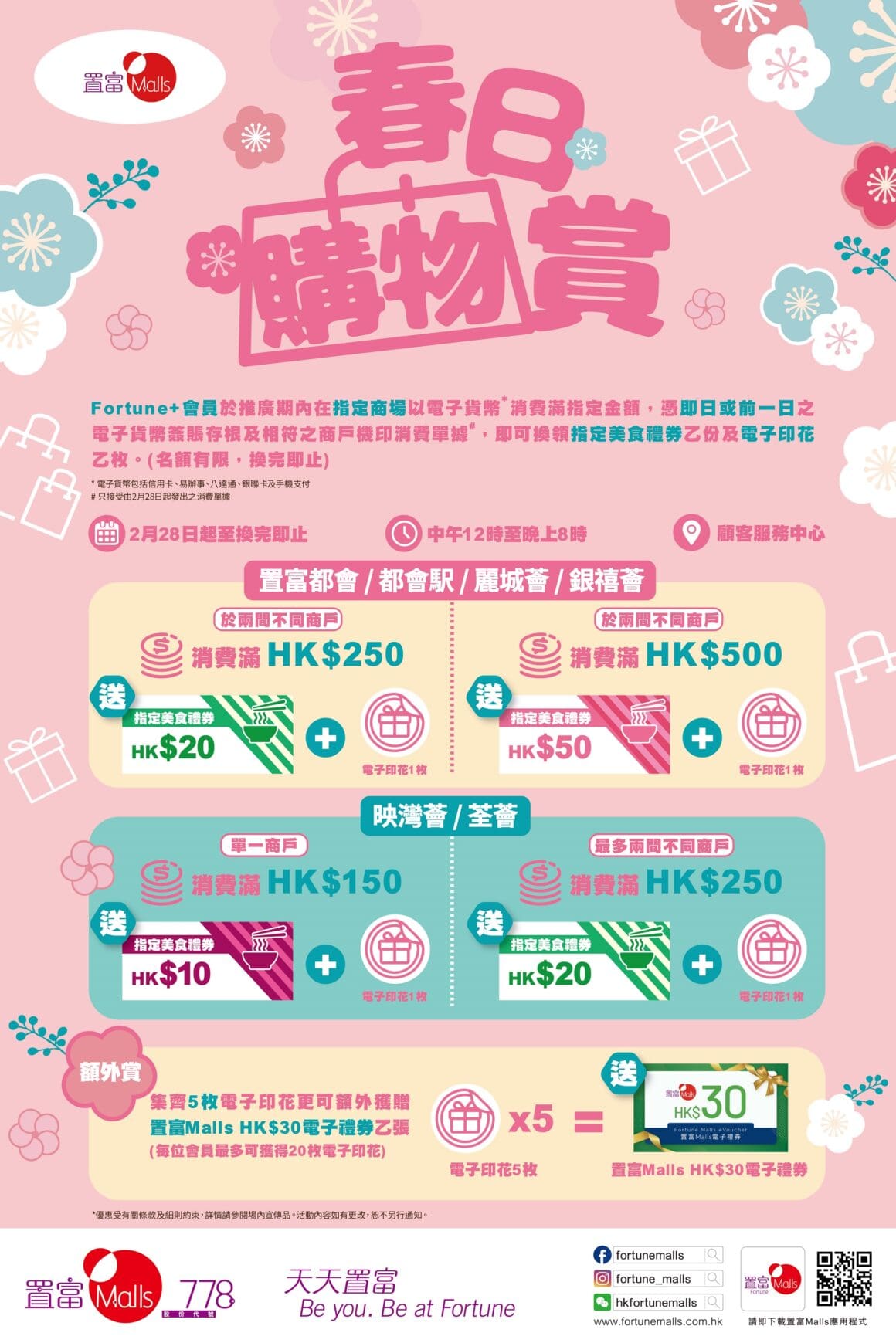 2 月 28 日起消費最高換港幣 $50 儲滿 5 枚印花再多賺港幣 $30踏入春日,置富 Malls 聯乘日本人氣角色 SHO-CHAN 推出「春日購物賞」。Fortune+ 會員由 2 月 28 日起於指定商場以電子貨幣消費,即可即時換領美食禮券及電子印花,最高可獲港幣 $50 美食禮券。於置富都會、都會駅、麗城薈及銀禧薈,兩間不同商戶累積消費滿港幣 $500,即可換領港幣 $50 美食禮券及 1 枚電子印花;消費滿港幣 $250,可換領港幣 $20 美食禮券及 1 枚電子印花。集齊 5 枚電子印花,更可額外獲贈港幣 $30 電子禮券,讓每筆消費都可延續回贈。