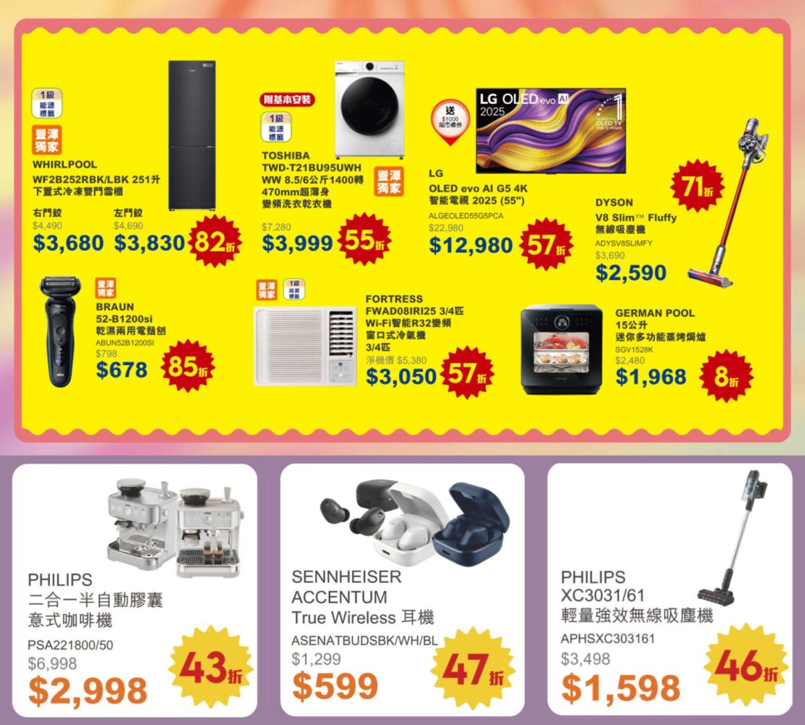 推廣期內,豐澤門市及網店同步精選逾 800 件人氣產品低至 1.8 折,涵蓋家電、電腦、視聽娛樂、健康美容、廚房電器、旅行、寵物及母嬰等多個類別,可一次過購齊生活所需。