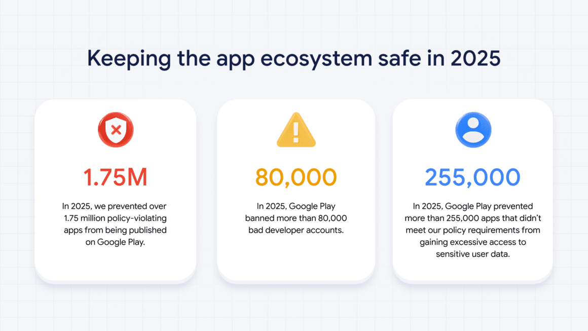 2025 年,Google 積極推行以 AI 技術為核心的多重防護機制,嚴防有害應用程式上架。全球範圍內,阻止超過 175 萬個違反政策的應用程式發布,封鎖逾 80,000 個企圖發布有害內容的開發者帳戶。此外,Google 新推出的開發者工具,包括開發者驗證、發布前強制審查及測試要求,不僅提升應用質量,也大幅減少不法開發者的入侵機會。每部應用都須通過超過 10,000 次安全檢查,且發布後仍會持續覆核,以確保安全與政策合規。