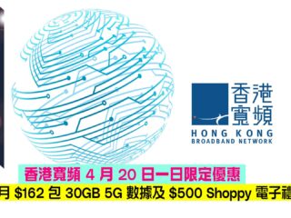 香港寬頻 4 月 20 日一日限定優惠,每月 $162 包 30GB 5G 數據及任用本地社交數據 $500 Shoppy 電子禮券