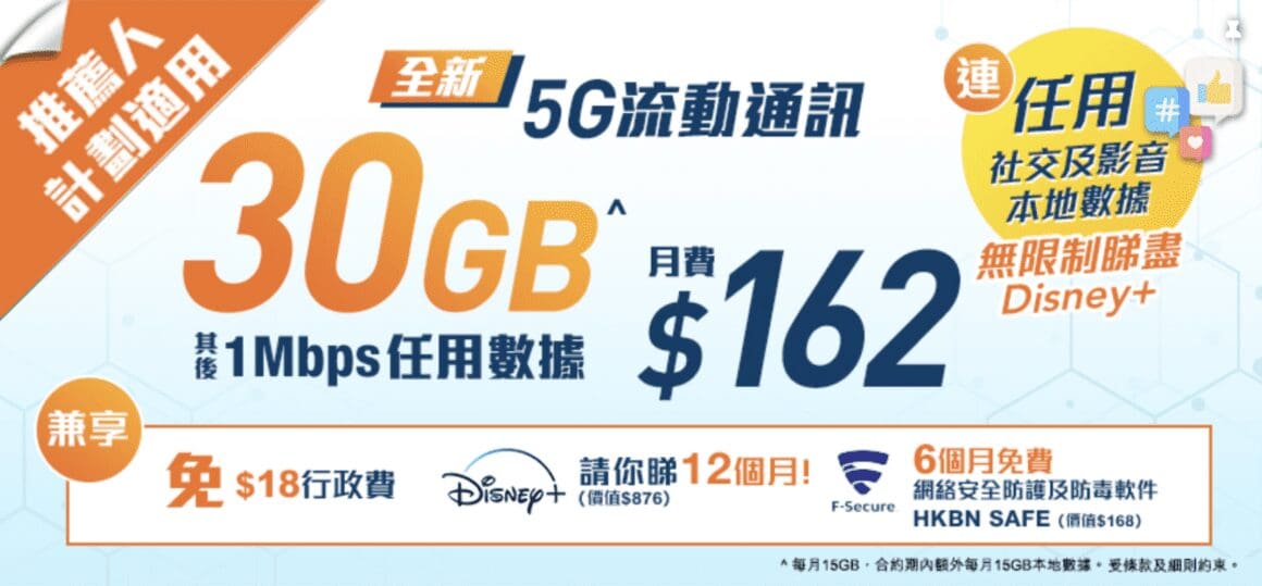 香港寬頻全新 5G 計劃,每月 $162 有 30GB 5G 本數據(其後 1Mbps 任用數據),無限數據任看各大串流平台及社交程式包括 Facebook、 Instagram、WhatsApp、 LINE、 WeChat、Signal 、Zoom、YouTube、Netflix、Disney+ 、Apple TV 、myTV SUPER 及 hmvod。計劃更免 $18 行政費及最多 180 日延遲生效日,兼享 12 個月任你睇(價值 $876 )。即到香港寬頻官網登記。