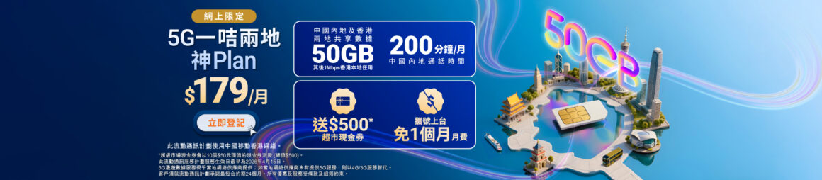- 一卡兩地神 Plan(50GB 中港共享數據 + 200 分鐘中國內地通話時間):月費港幣 $179