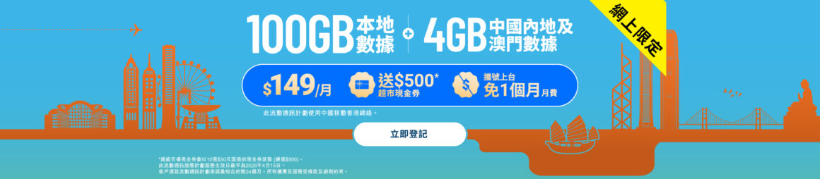 香港寬頻宣佈推出全新 5G 流動通訊計劃,主打中港兩地數據服務,月費由港幣 $149 起,提供每月 100GB 本地 5G 數據連 4GB 中國內地及澳門數據,適合頻繁往返兩地的商務及旅遊人士。凡成功登記並生效指定計劃,可獲 12 個月影視平台訂閱或港幣 $500 超市現金券(網上登記限定),優惠由 3 月 30 日起接受登記。
