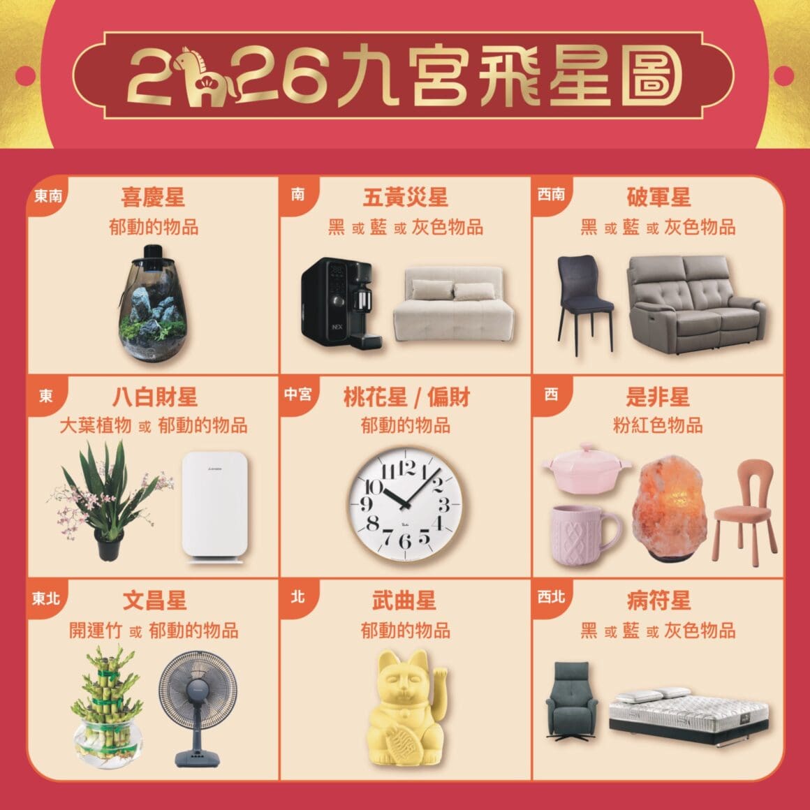本次活動重點之一,為唐碧霞師傅於 1 月 31 及 2 月 1 日兩日舉行的家居開運風水講座,教授如何鎖定馬年催旺的四大方位。唐師傅建議東北方擺放書枱及四支水種直立富貴竹,有助鞏固氣場並促進事業發展與學業進步。中宮則建議擺放時鐘或搖擺物品以激活桃花星和偏財運。東南方可放置苔蘚微景觀提升社交及財富喜慶能量,北方則適合擺放招財貓及流水擺設增強事業穩定與信心。此外,師傅提醒是非星位於西方,宜擺放粉紅色物品如抱枕、床單或裝飾品以化解負面氣場。講座亦將深入解析「丙午馬年九宮飛星陣」,為每個方位提供具體佈局建議,幫助客廳、睡房與書房的財位佈局與風水調整。