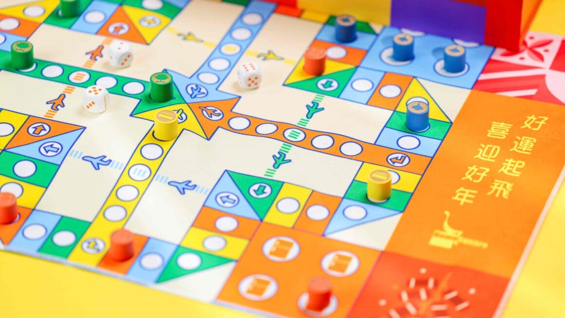 沙田 HomeSquare 開運「棋」福玩樂套裝,包括家居造型飛行棋、家居版魚蝦蟹、茶具套裝。