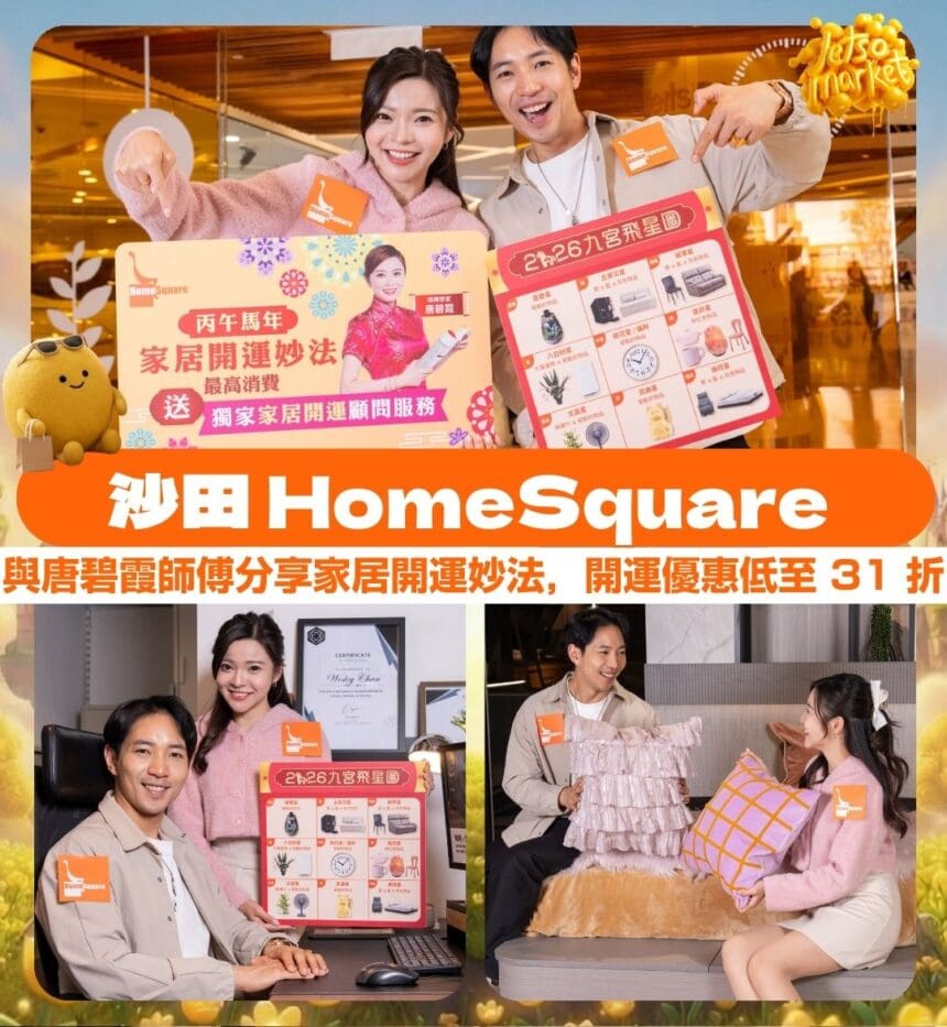 迎接 2026 丙午馬年,沙田 HomeSquare 隆重推出「棋」福花韻新春庭園主題活動,期間由 2 月 10 日至 3 月 1 日,成功結合傳統風水智慧與現代家居美學,特別邀請堪輿學家唐碧霞師傅展示馬年家居開運妙法,並親身主持家居開運風水講座,教導簡易家具擺設與空間佈局技巧,幫助提升事業、健康、財運及桃花運勢。除講座外,更有家居開運市集於 2 月 7 至 8 日兩日舉行,聚集多款吉祥擺設與賀年精品,適合迎新歲添置美好節日用品。另外,活動期間更推出三重新春開運禮遇,包括寓意團聚的「棋」福玩樂套裝、融合沙田四景特色的利是封,以及本地設計師 Neil Wang 打造的限量「花韻滿滿小地毯」,為家居增添春日氣息。多項家具低至港幣 $1,488 起,折扣低至 31 折,吸引家居愛好者及新春送禮人士把握優惠。