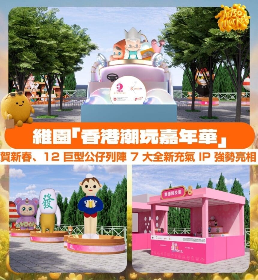 由香港品牌玩具協會主辦、文創產業發展處贊助的「香港潮流玩具花車」於新春巡遊亮相後,熱潮正式延伸至第三階段。2026 年 2 月 20 日至 3 月 3 日,「香港潮玩嘉年華」將於銅鑼灣維多利亞公園南亭廣場舉行,集合 12 個人氣品牌及原創 IP 公仔,再加上 7 款全新充氣雕塑首度公開,同場設兩大互動遊戲送限定揮春及珍藏明信片,打造維園期間限定潮玩聖地,延續馬年節慶氣氛。