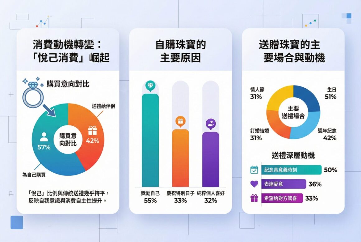 過去,購買鑽石首飾往往與浪漫場合掛鉤。今年的調研卻帶來明顯轉變:57% 受訪者計劃為自己購買珠寶,當中最主要原因是獎勵自己(55%),其次是慶祝特別日子(33%)及純粹個人喜好(32%)。「悅己消費」的比例幾乎與傳統送禮給伴侶的意願(42%)持平,反映香港消費者的自我意識與消費自主性日益提升。當然,生日(51%)與週年紀念(42%)依然是送贈珠寶的主要場合,情人節(31%)與訂婚結婚(31%)緊隨其後。送禮背後最深層的動機,是「紀念具意義時刻」(50%),其次是表達愛意(36%)及希望給對方驚喜(33%)。