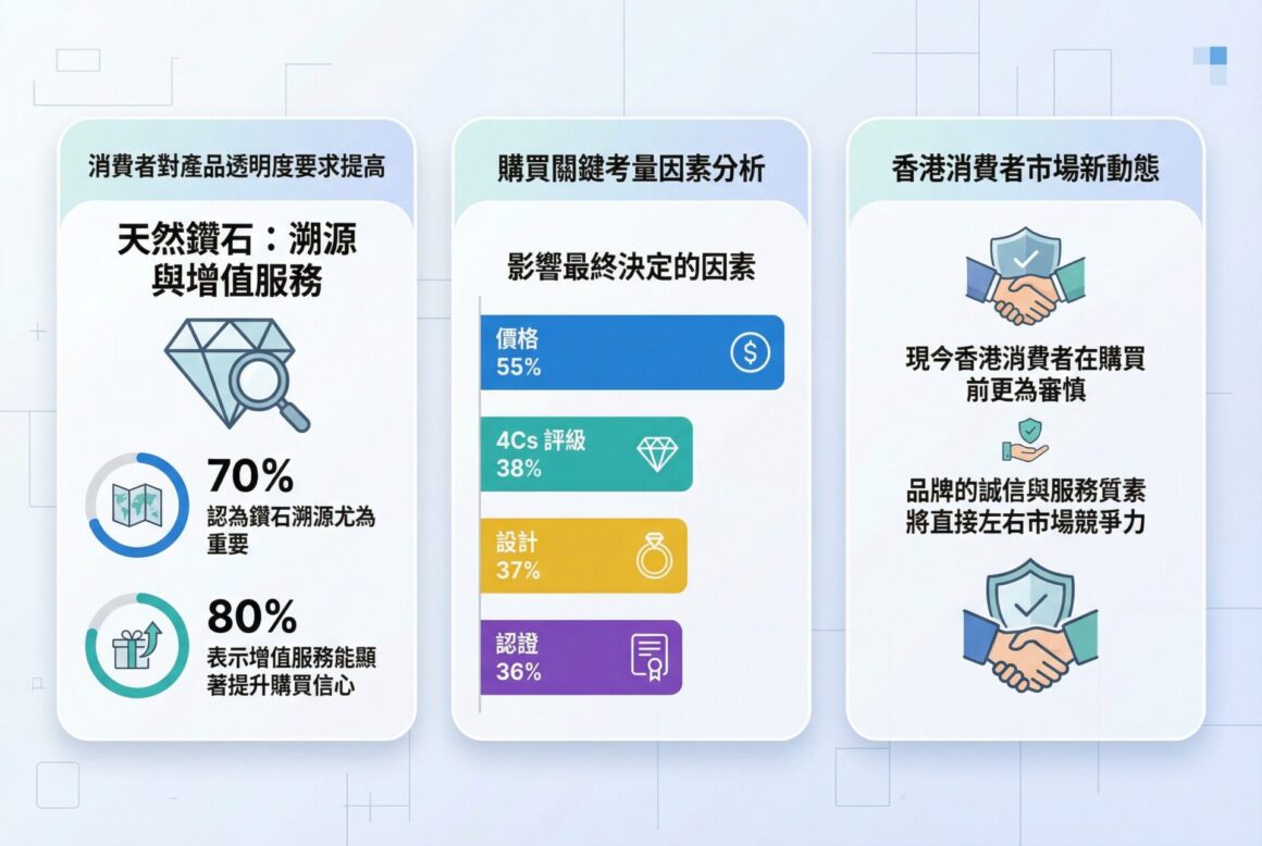 今年的調研另一個值得關注的趨勢,是消費者對產品透明度的要求明顯提高。有意購買天然鑽石的受訪者中,70% 認為鑽石溯源尤為重要;80% 表示增值服務能顯著提升購買信心。價格固然是主要考量因素(55%),但 4Cs 評級(38%)、設計(37%)及認證(36%)同樣影響最終決定。這說明現今香港消費者在購買前更為審慎,品牌的誠信與服務質素將直接左右市場競爭力。