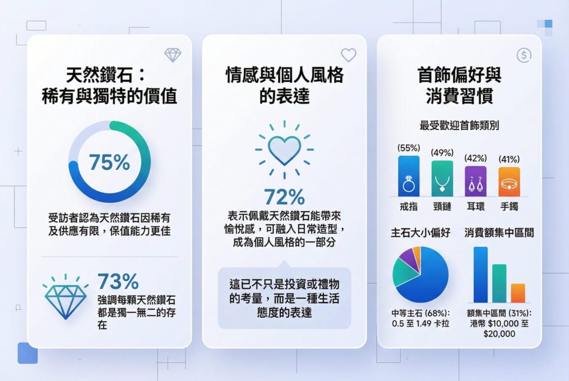 為甚麼消費者仍然首選天然鑽石?這份研究給出了清晰答案。75% 受訪者認為天然鑽石因稀有及供應有限,保值能力更佳;73% 強調每顆天然鑽石都是獨一無二的存在。更重要的是情感層面:72% 表示佩戴天然鑽石能帶來愉悅感,可融入日常造型,成為個人風格的一部分。這已不只是投資或禮物的考量,而是一種生活態度的表達。在首飾類別上,戒指(55%)、頸鏈(49%)、耳環(42%)及手鐲(41%)是最受歡迎的選擇。消費者偏愛 0.5 至 1.49 卡拉的中等主石(68%),消費額則集中於港幣 $10,000 至 $20,000 之間(31%)。