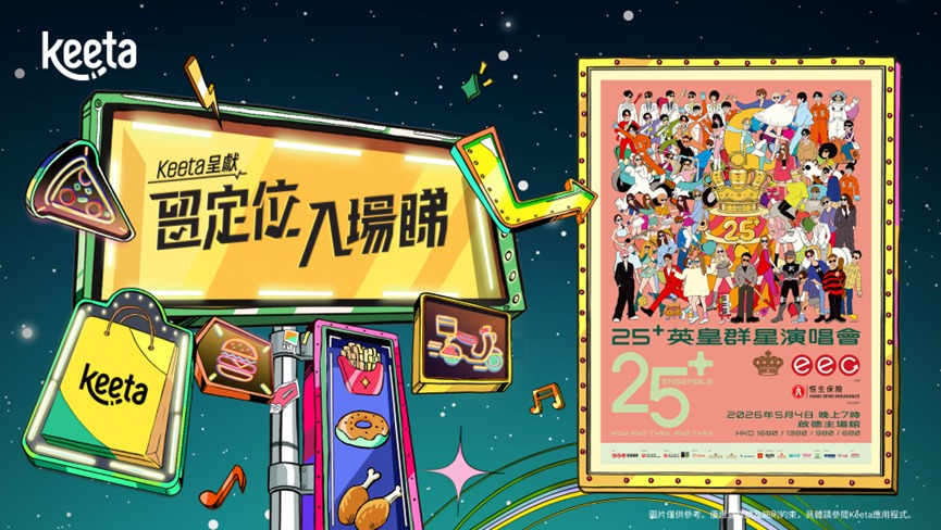 Keeta 宣佈推出「留定位 入場睇」第二期活動,贊助《25+ 英皇群星演唱會》,為樂迷用戶送出演唱會門票。由 4 月 7 日至 4 月 13 日,用戶只需於指定餐廳完成 2 張外賣訂單,每單實際支付滿港幣 $250,即可獲得搶票資格,有機會贏取演唱會門票 2 張,親臨現場感受本地樂壇盛事。