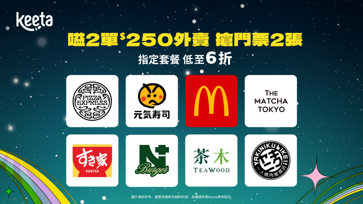 今次活動有多間人氣餐廳參與,包括 McDonald’s、PizzaExpress、Genki Sushi、燒肉 Like、Matcha Tokyo、SUKIYA、Teawood 及 N+ Burger。涵蓋快餐、日式料理、燒肉、漢堡等多種選擇,用戶在活動期間於以上餐廳透過 Keeta 落單,即可累積訂單資格參與搶票。