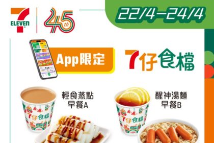 7-Eleven App 早餐限時優惠,港幣 $25 輕食蒸點及醒神湯麵,限量折扣及出前一丁限定購物袋…