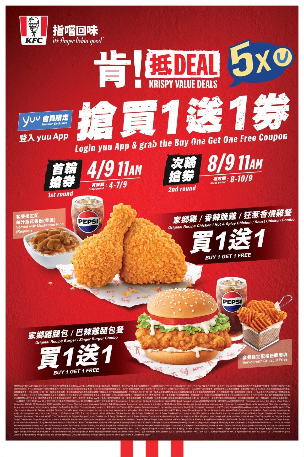 未能於第一輪成功入手的粉絲不用擔心,第二輪搶券將於 9 月 8 日(星期一)上午 11 時 再度開放,優惠內容同樣包括炸雞餐及雞腿包餐買一送一。記得提早登入 yuu App,準時搶券,把握最後機會!