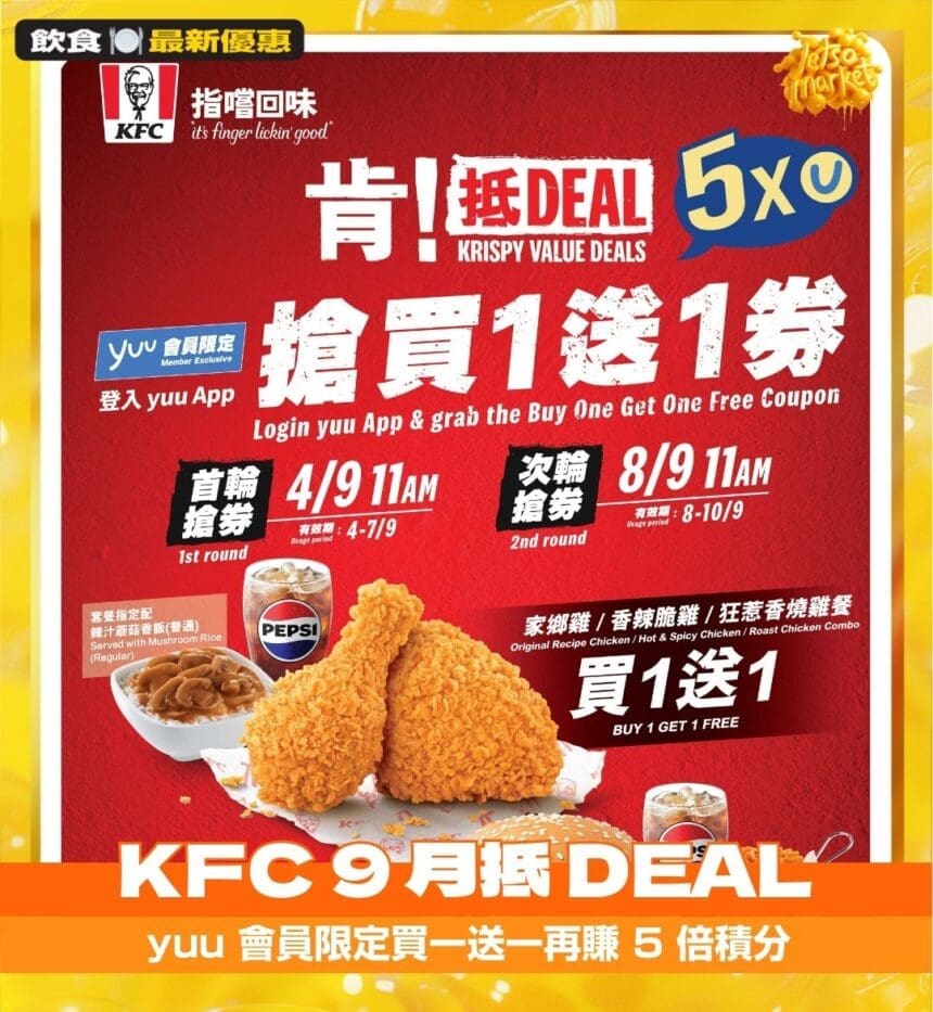 KFC 人氣「肯!抵DEAL」優惠再度回歸,今個 9 月帶來連環驚喜!由 9 月 4 日起,yuu 會員只需透過 yuu App 搶券,即可享用 指定套餐買一送一,再加碼送出 5 倍積分獎賞。炸雞迷絕對不能錯過,一次過滿足味蕾與荷包!
