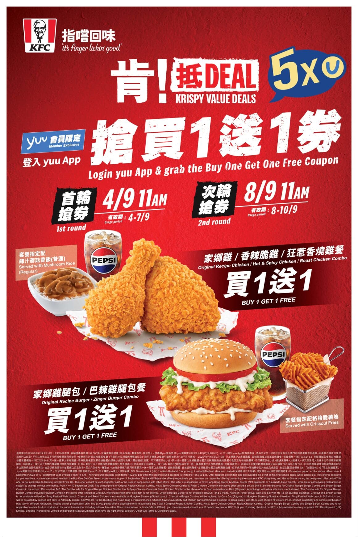 • KFC「肯!抵DEAL」重磅回歸 —— 9 月 4 日及 9 月 8 日兩輪搶券,yuu 會員可享指定套餐買一送一。