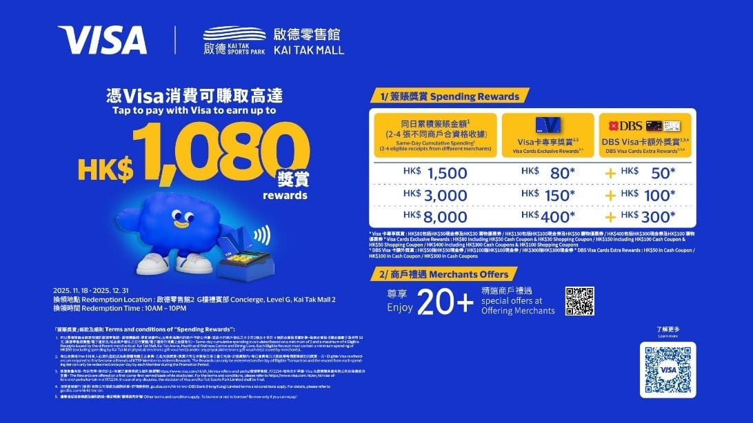 啟德體育園連串活動期間推出四重大獎賞。獎賞一至 2025 年 12 月 20 日,「啟德體育園之友」會員可憑 2025 年立法會換屆選舉投票所得「心意謝卡」,兌換價值港幣 $300 啟德零售館購物禮券(數量有限,先到先得)。獎賞二至 2025 年 12 月 31 日,使用 Visa 卡於指定商戶消費可享高達港幣 $1,080 簽賬獎賞,包括現金券及購物優惠。獎賞三至 2026 年 1 月 11 日,「啟德體育園之友」會員於指定場所當日累積消費滿港幣 $5,000,可換領香港迪士尼樂園門票 1 張,滿港幣 $8,000 可換兩張,名額有限。獎賞四為新會員禮遇,首次登記成為會員並掃描指定二維碼,即可領取 TaRa Bloom 指定飲品免費或優惠價港幣 $16 購買,指定飲品包括玫瑰椰乳(中杯,價值港幣 $36)、玫瑰椰青(大杯,價值港幣 $32)及玫瑰茉莉(大杯,價值港幣 $28)。所有優惠受條款細則約束。