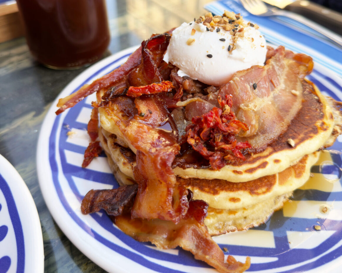 煙肉水波蛋班戟厚實有份量,煙肉香脆,加入番茄後有效減輕整體的膩感,甜鹹比例拿捏精準,吃起來毫無厚重感,令人意外地輕盈。