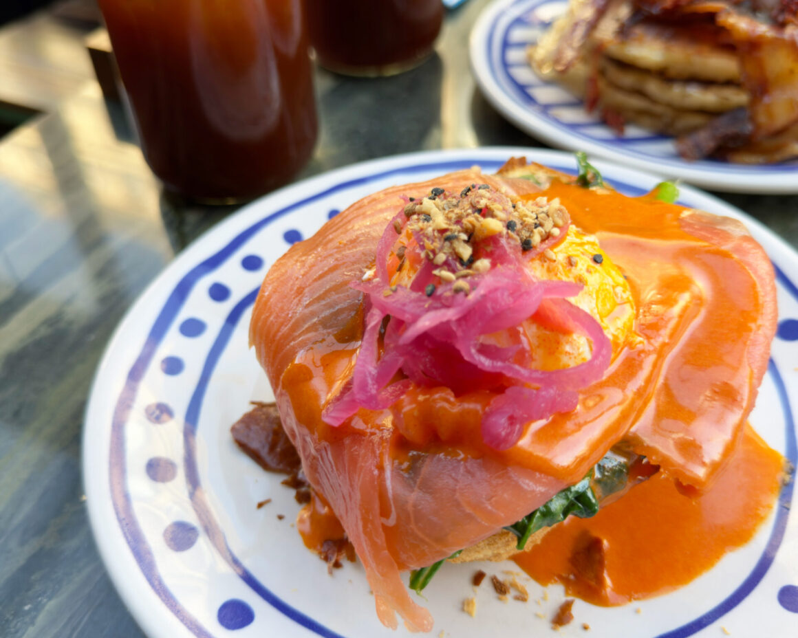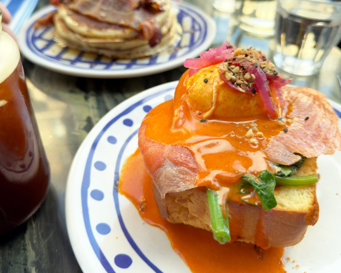 菜單以兩款菜式最為突出。煙肉水波蛋班戟厚實有份量,煙肉香脆,加入番茄後有效減輕整體的膩感,甜鹹比例拿捏精準,吃起來毫無厚重感,令人意外地輕盈。Brioche Salmon Benedict 則以 Brioche 麵包作底,配搭煙三文魚與荷蘭汁,後者帶有一絲煙燻氣息,與煙三文魚的層次相互呼應,切開蛋黃的一刻汁液緩緩流出,口感與味道均屬上乘,是巴黎數一數二的 Eggs Benedict 選擇