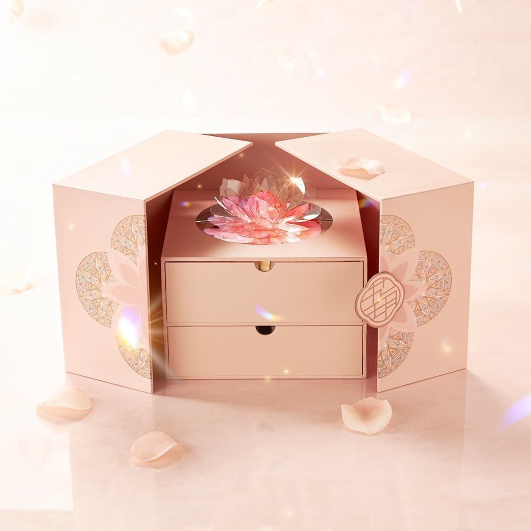 這款禮盒以淡粉色為主色調,打開餅盒即見鮮明立體錦花呈現,內藏八件流心手工月餅,包括經典奶黃、陳皮奶黃、開心果榛子及海鹽焦糖生榨椰子拿鐵。抽屜式設計的餅盒具靈活性,節後可作為首飾箱或收納用途,循環再用,環保實用。
