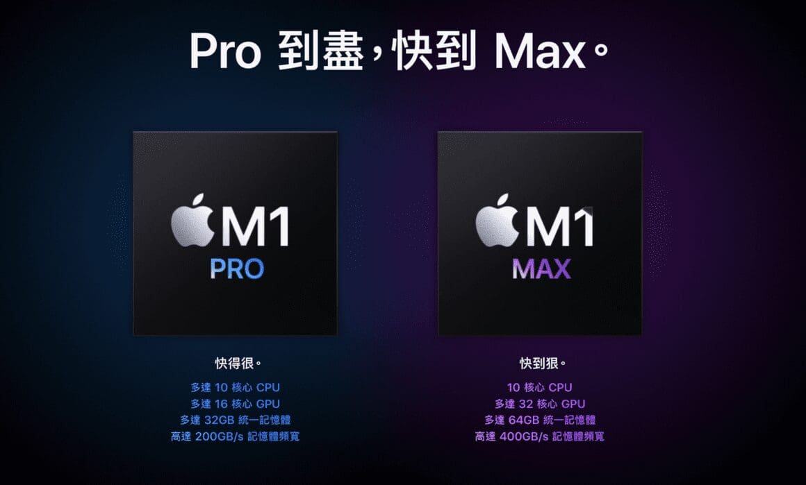 M1 Max 是全球最強勁的專業手提電腦晶片,建基於 M1 Pro,將各種精彩功能提升至更高層次。M1 Max 配備與 M1 Pro 相同、效能強勁的 10 核心 CPU,GPU 雙倍提升至多達 32 核心,GPU 效能表現比 M1 快達 4 倍。它亦備有高達 400GB/s 的記憶體頻寬,是 M1 Pro 的 2 倍及 M1 的 6 倍左右,同時備有多達 64GB 的快速統一記憶體。當最新 PC 手提電腦的影片記憶體最多只達到 16GB,M1 Pro 及 M1 Pro Max 能夠提供如此大量的記憶體以應付效能要求極高的工作,實在是顛覆常規的改革,更讓專業用户在手提電腦上做到以往無法想像的任務。