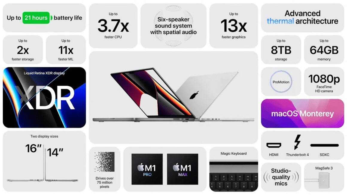全新 MacBook Pro 備有 14 吋及 16 吋型號可供選擇,配備絢麗奪目的 Liquid Retina XDR 顯示器,三個 Thunderbolt 4 連接埠,HDMI 連接埠, 1 個支援高阻抗耳筒的改良耳筒插口及 SD 卡槽,而 MacBook 用家最愛的 MagSafe 亦都同樣回歸,更首次支援快速充電,僅需 30 分鐘即可充電至 50% 。螢幕方面採用 iPad Pro 使用的 mini-LED 技術,可提供高達 1,000 尼特的持續全螢幕亮度、超凡的 1,600 尼特峰值亮度及 1,000,000:1 對比度,更首次支援 ProMotion 高達 120Hz 的自動適應更新頻率。