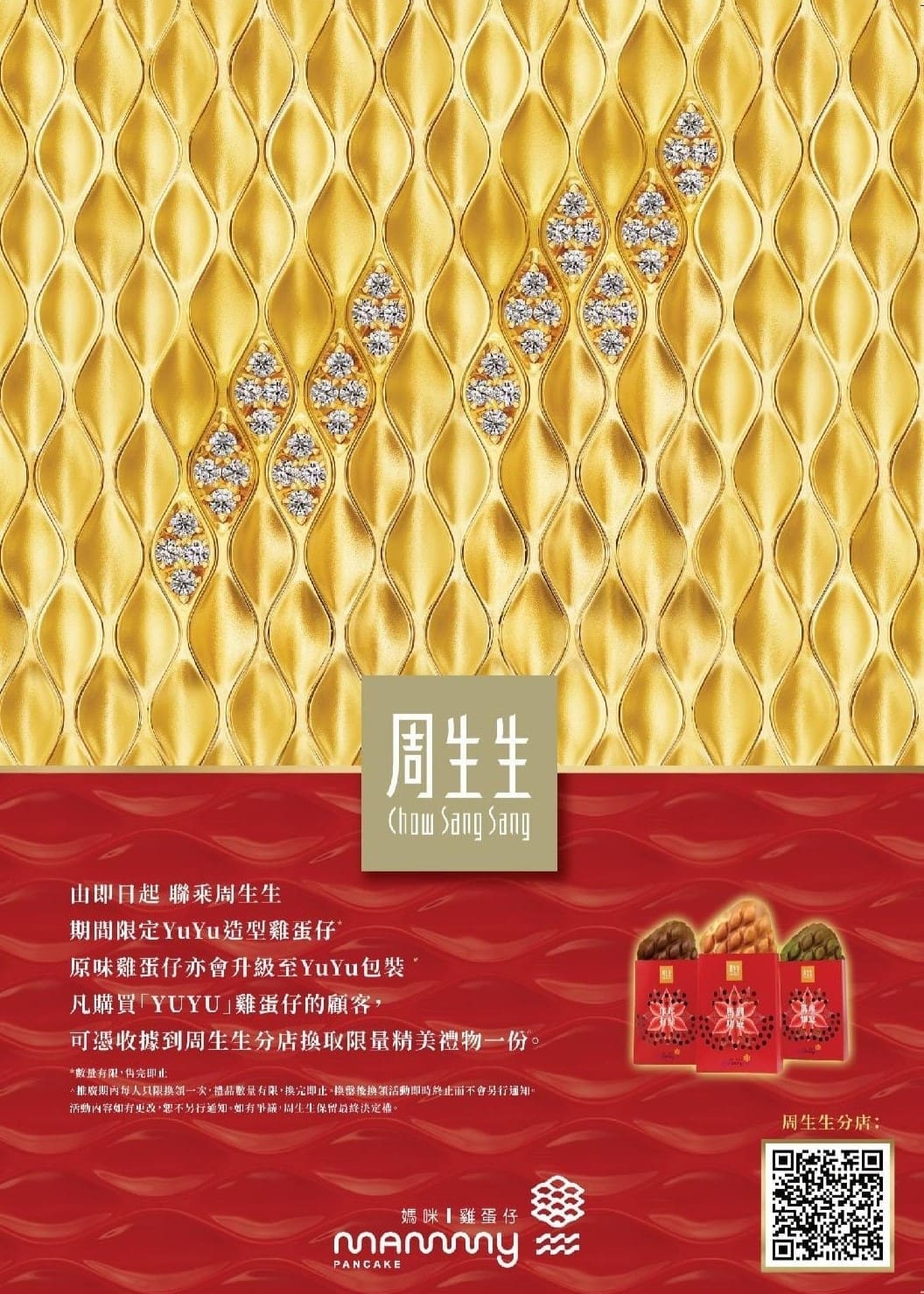 由即日起至 3 月 31 日,於媽咪雞蛋仔全線香港分店購買任何口味雞蛋仔,憑單一收據即可到周生生香港全線分店,免費換領限量精美禮品一份。
