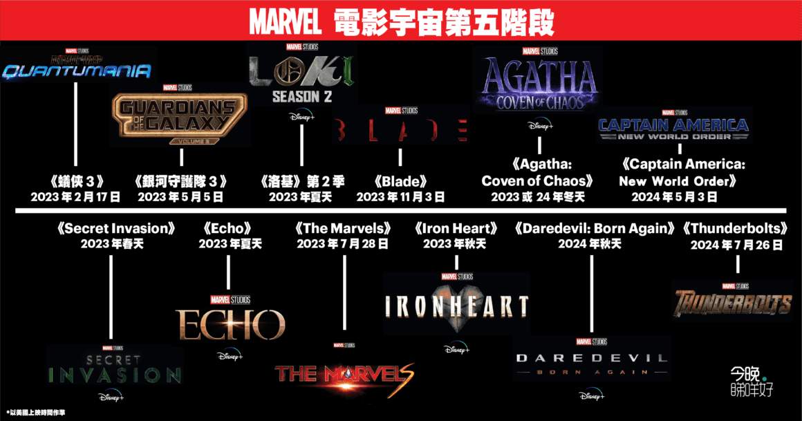 MCU 第五階段共有 12 部作品,包括六部電影及六部劇集(以美國上畫日期):