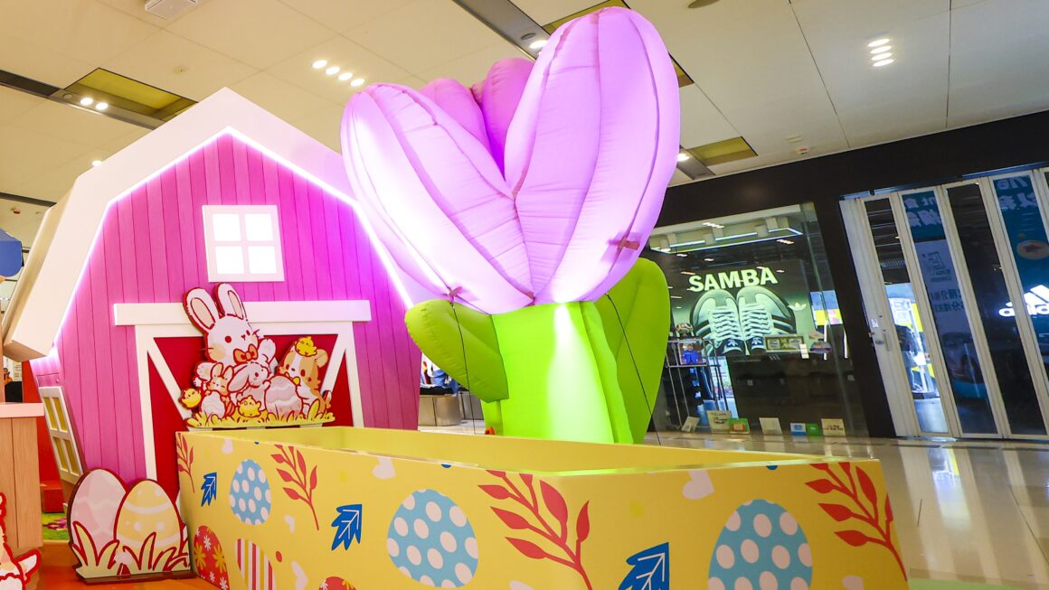 活動焦點是逾 3.5 米高的巨型充氣「Lazy Corgi」,換上復活兔造型,抱著大紅蘿蔔慵懶坐在花圃中央。場內另設多個主題打卡裝置,構成一片充滿春日氣息的田園風光。
