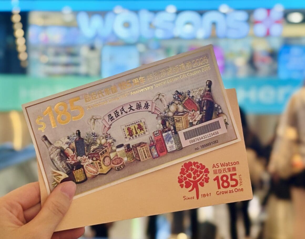臣氏集團亦同步推出「185 周年特別珍藏版禮券」,禮券設計靈感源自屈臣氏大藥房的經典產品,兼具實用與收藏價值,將於 2026 年 2 月底起於全港各品牌零售門市限量發售。