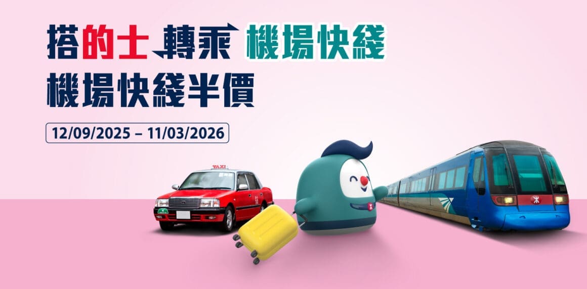 由 2025 年 9 月 12 日至 2026 年 3 月 11 日,乘客只需於入閘前於香港站、九龍站或青衣站客務中心出示即日港幣 $50 或以上的士收據,即可享八達通半價車票前往機場。