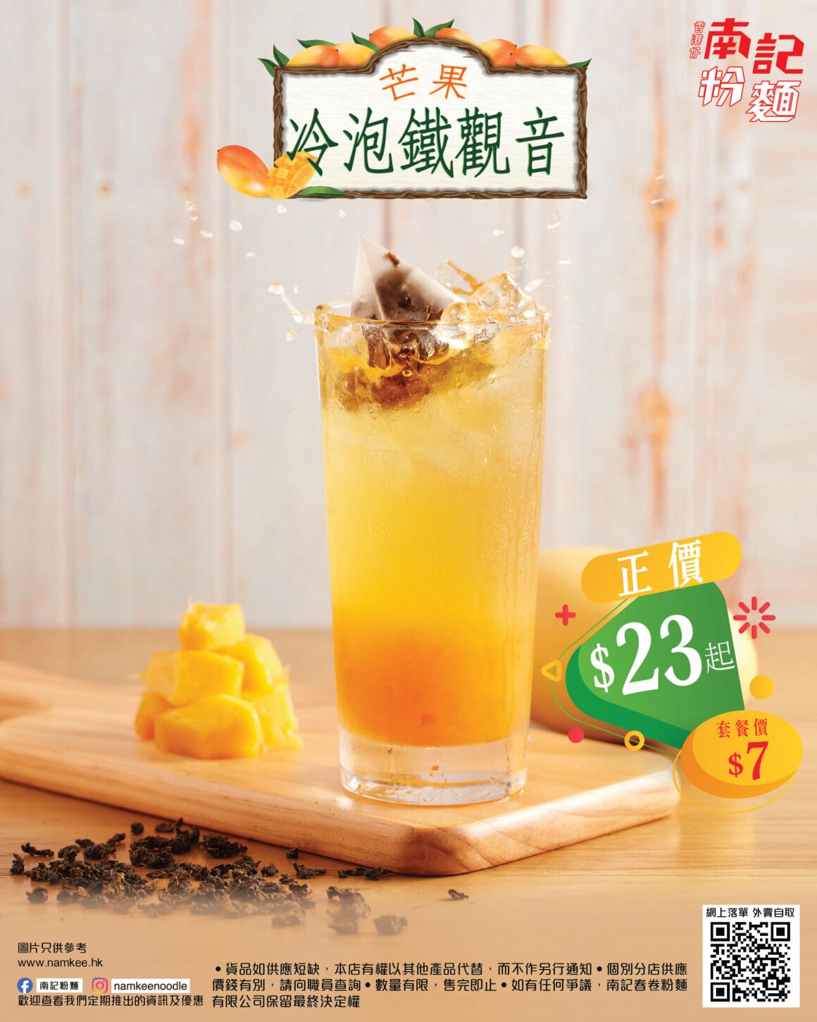 艇仔粉套餐亦附芒果冷泡鐵觀音。飲品以冷泡方式製作,減低茶葉苦澀感,同時保留鐵觀音醇厚茶香。芒果果香與茶香融合,帶來清新而甘甜的口感,配搭艇仔粉及炸物小食更為解膩。
